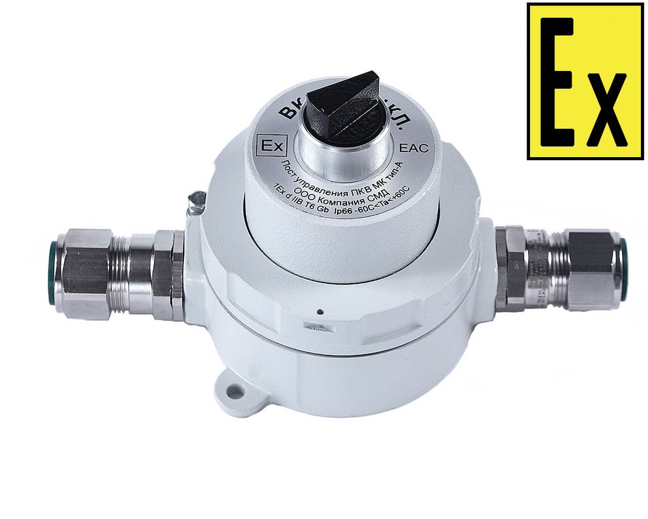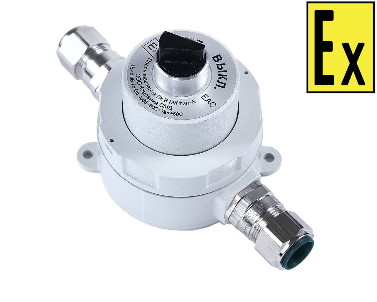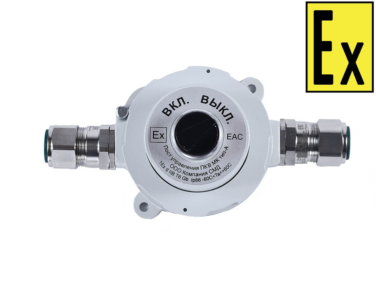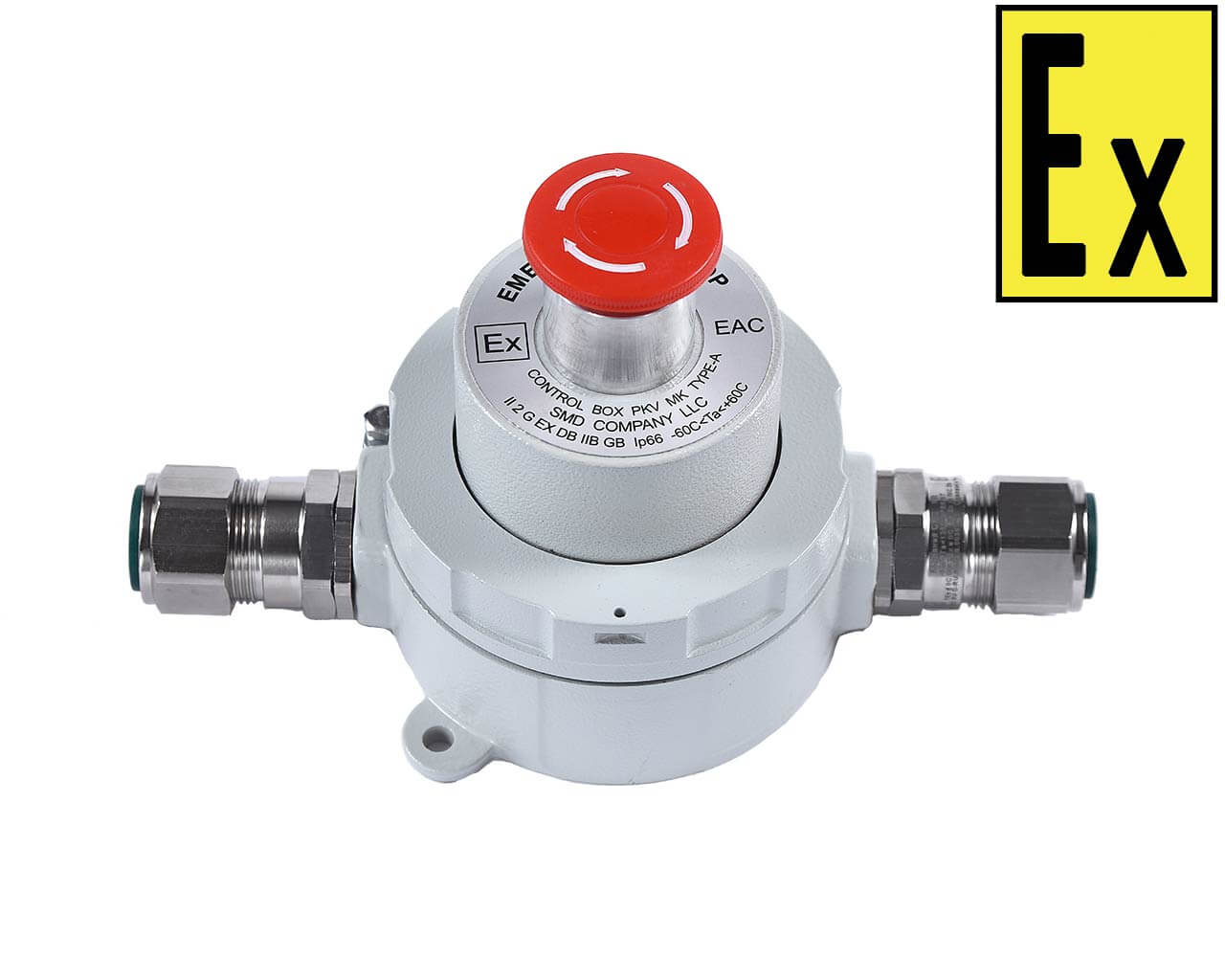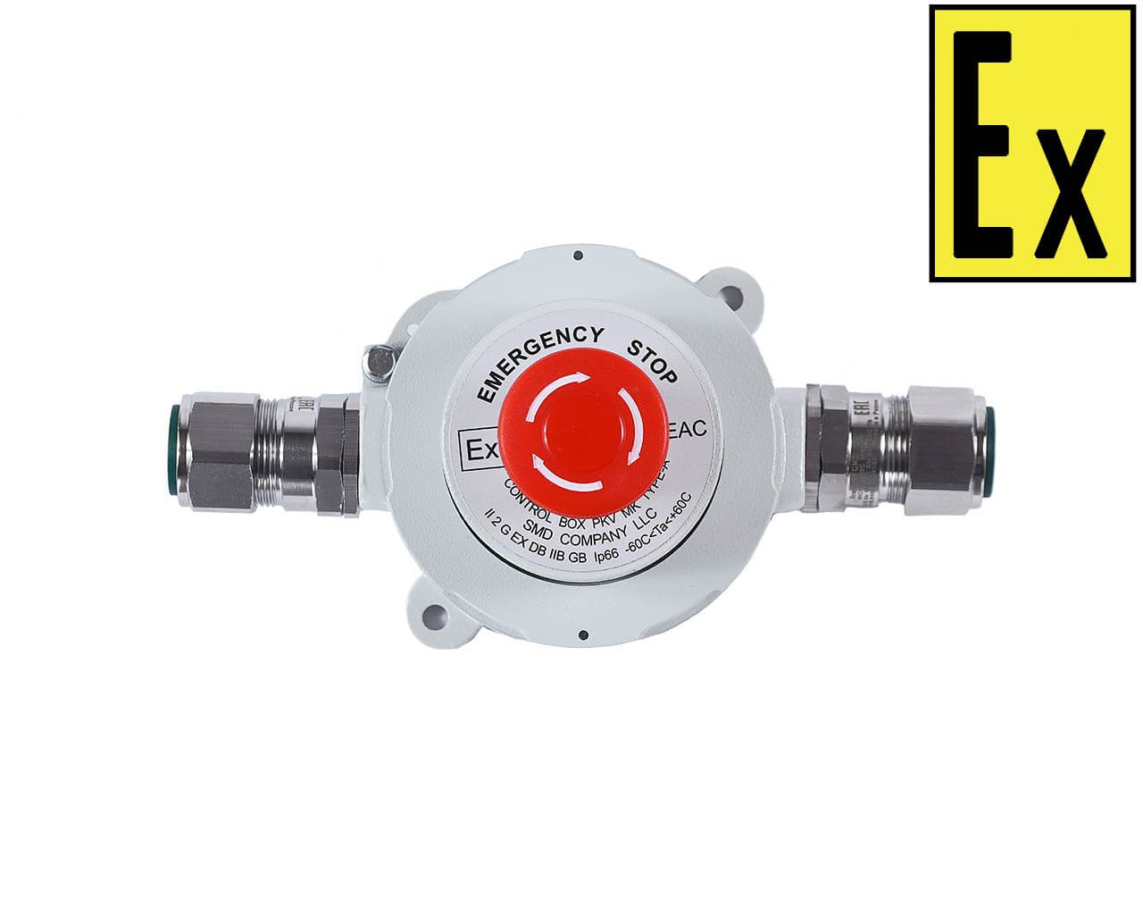 Control boxes are designed for connection or status indication of AC/DC circuits of commercial frequency in explosive zones. The boxes have explosion protection marking "1 ExdllBT6Gb" and can be used in explosive zones of Level 1 and 2. Enclosure material - aluminium alloy.