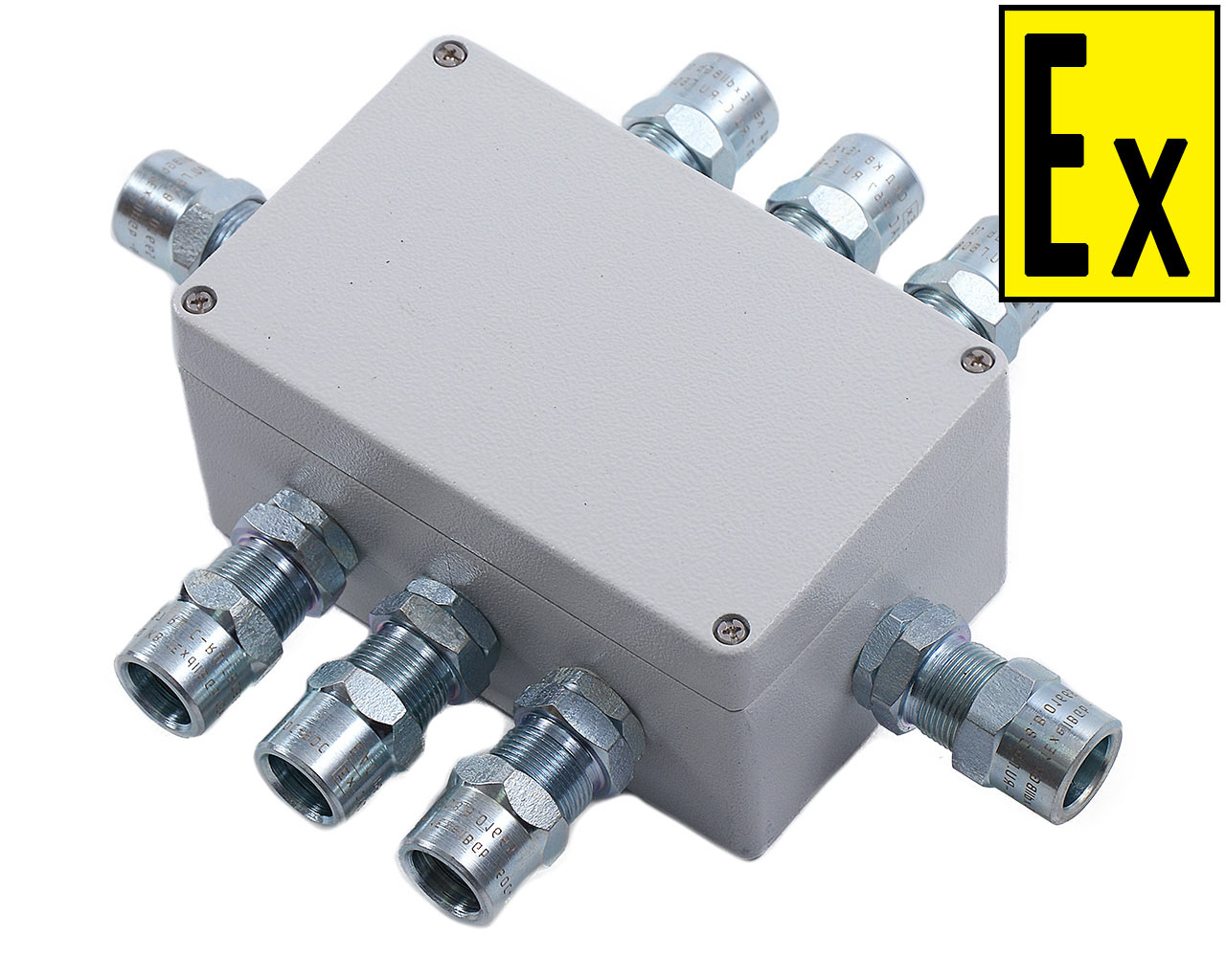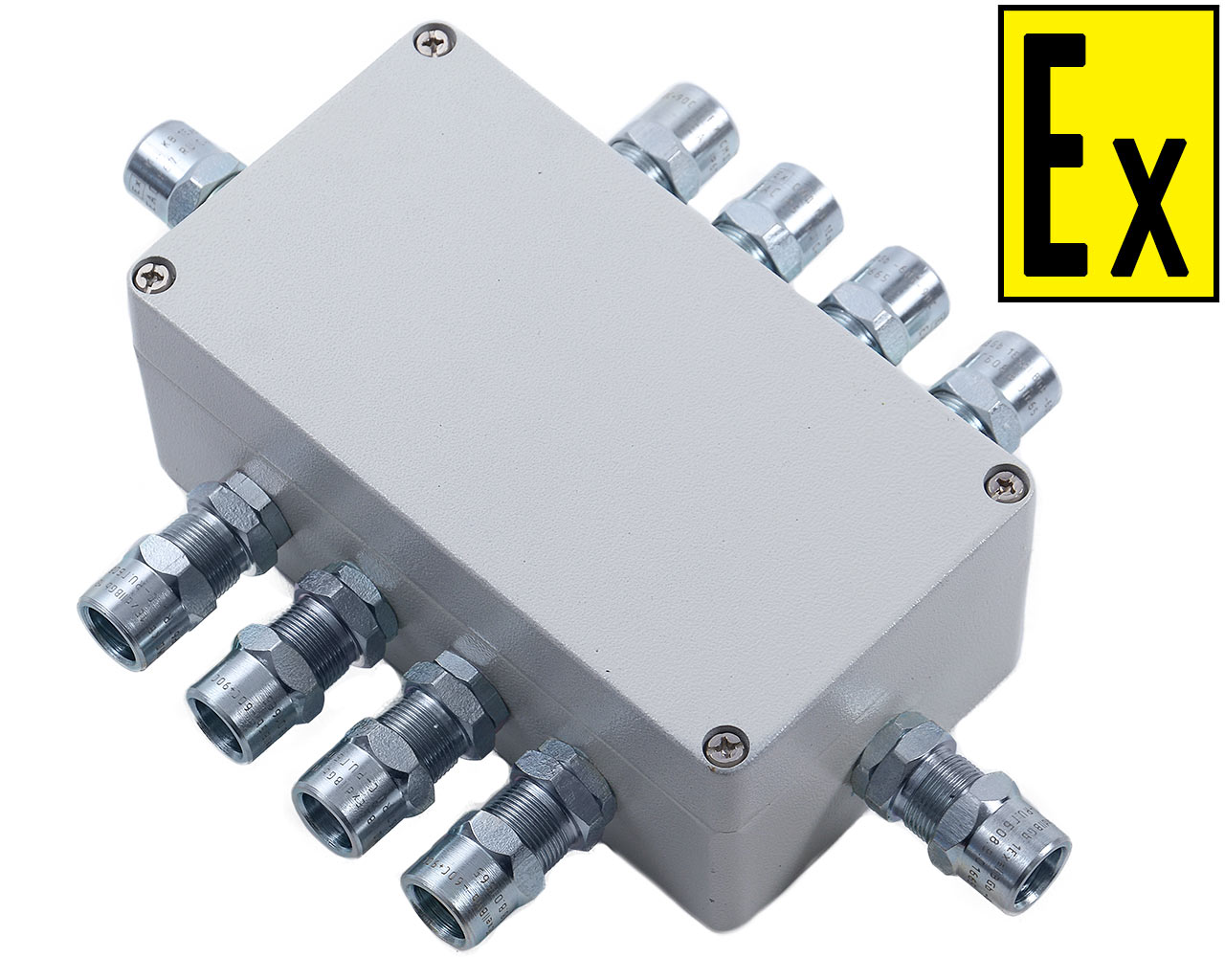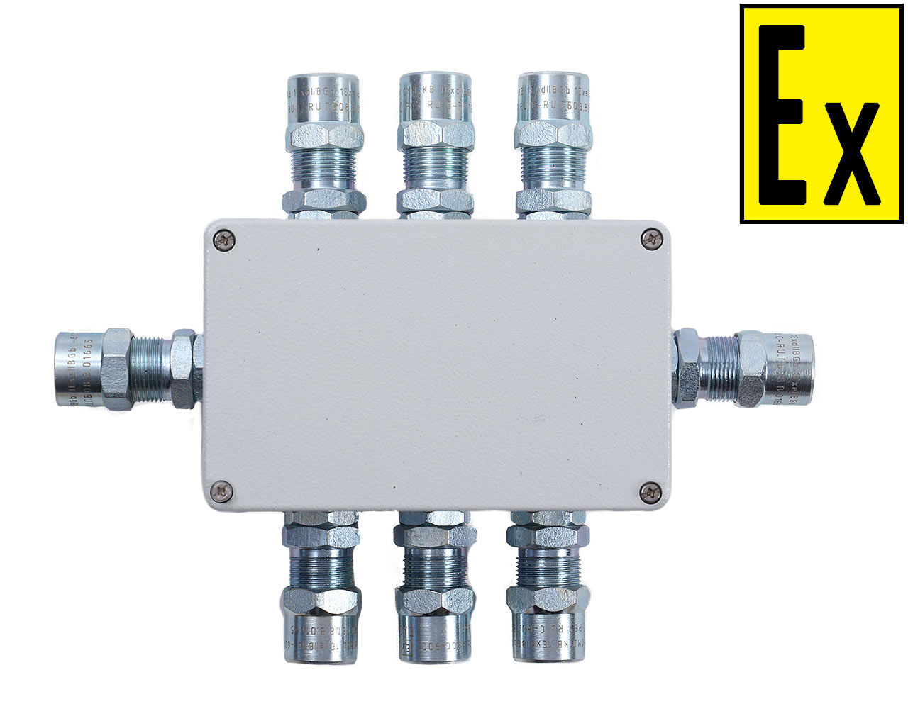 Boxes junction KVMK [ХХХХХХ] 1ExeIIBT5Gb are intended for making connections (branches) of electrical circuits of general and special purpose (power circuits, control circuits, signaling, etc.) in hazardous areas. & Nbsp; Boxes are designed to enter armored, non-armored electrical cables of circular cross-section and cables in metal hose.