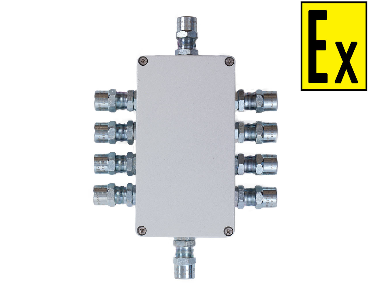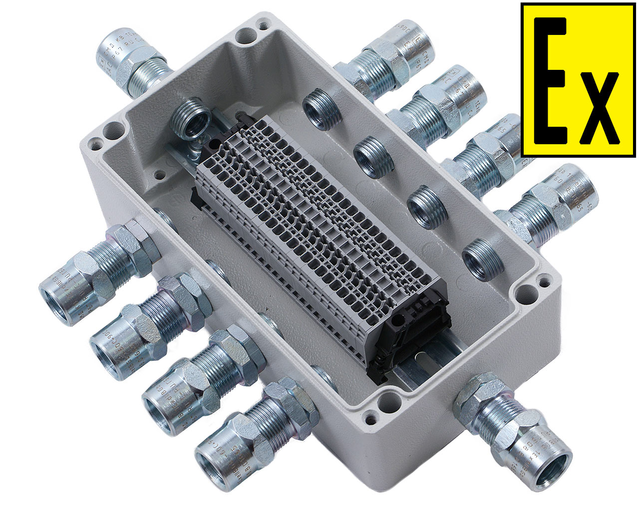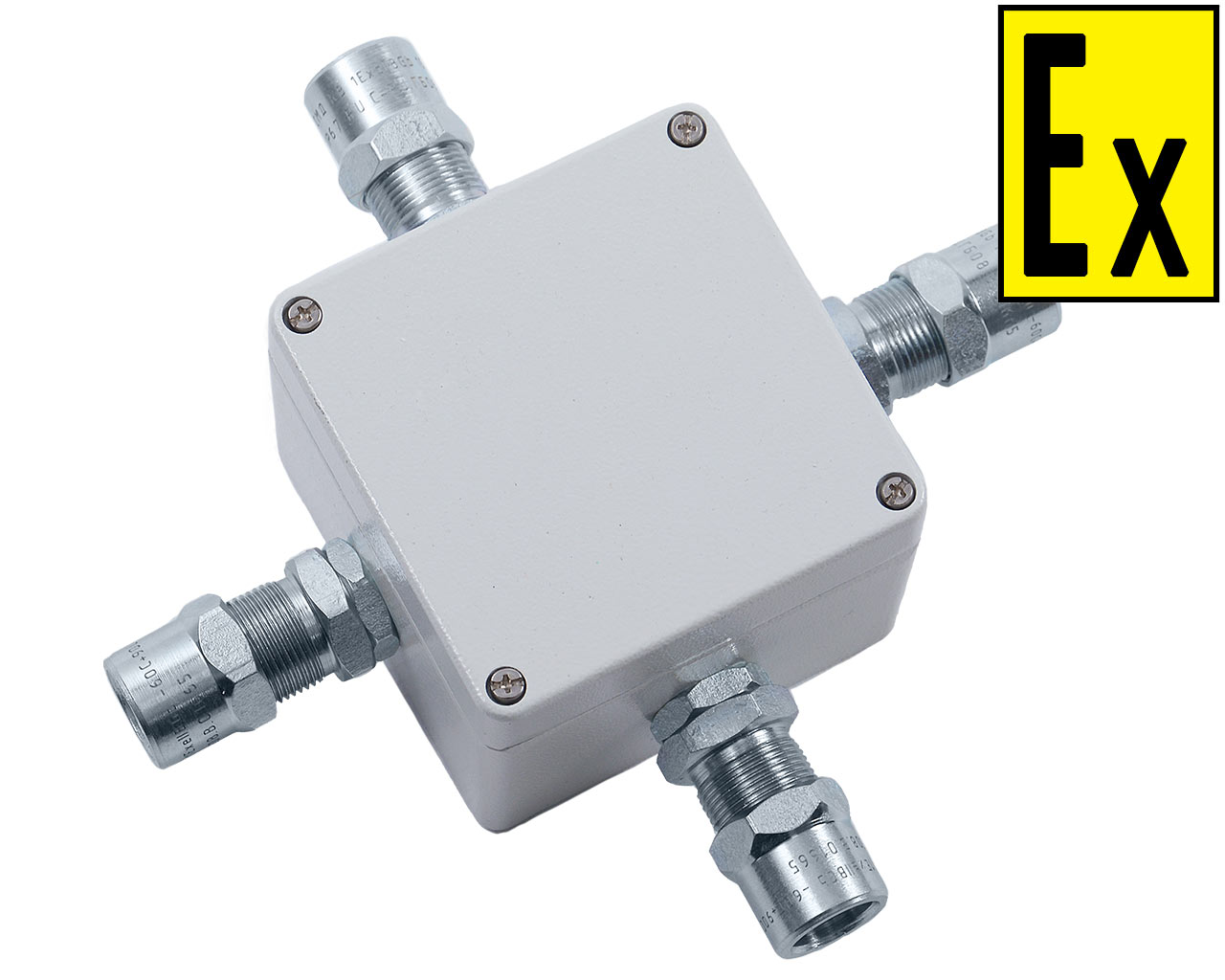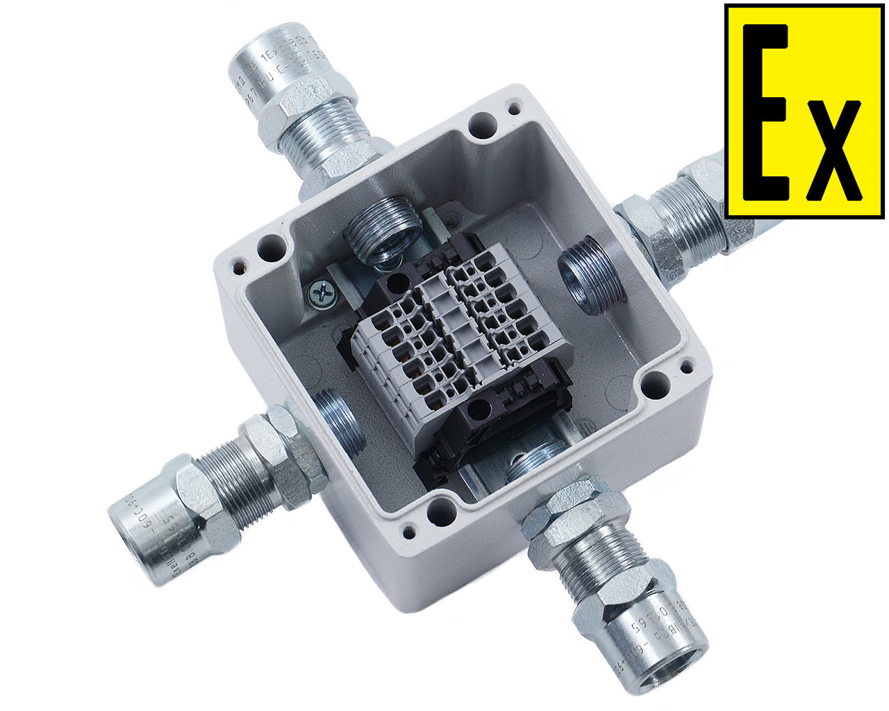 Boxes junction KVMK [ХХХХХХ] 1ExeIIBT5Gb are intended for making connections (branches) of electrical circuits of general and special purpose (power circuits, control circuits, signaling, etc.) in hazardous areas. & Nbsp; Boxes are designed to enter armored, non-armored electrical cables of circular cross-section and cables in metal hose.