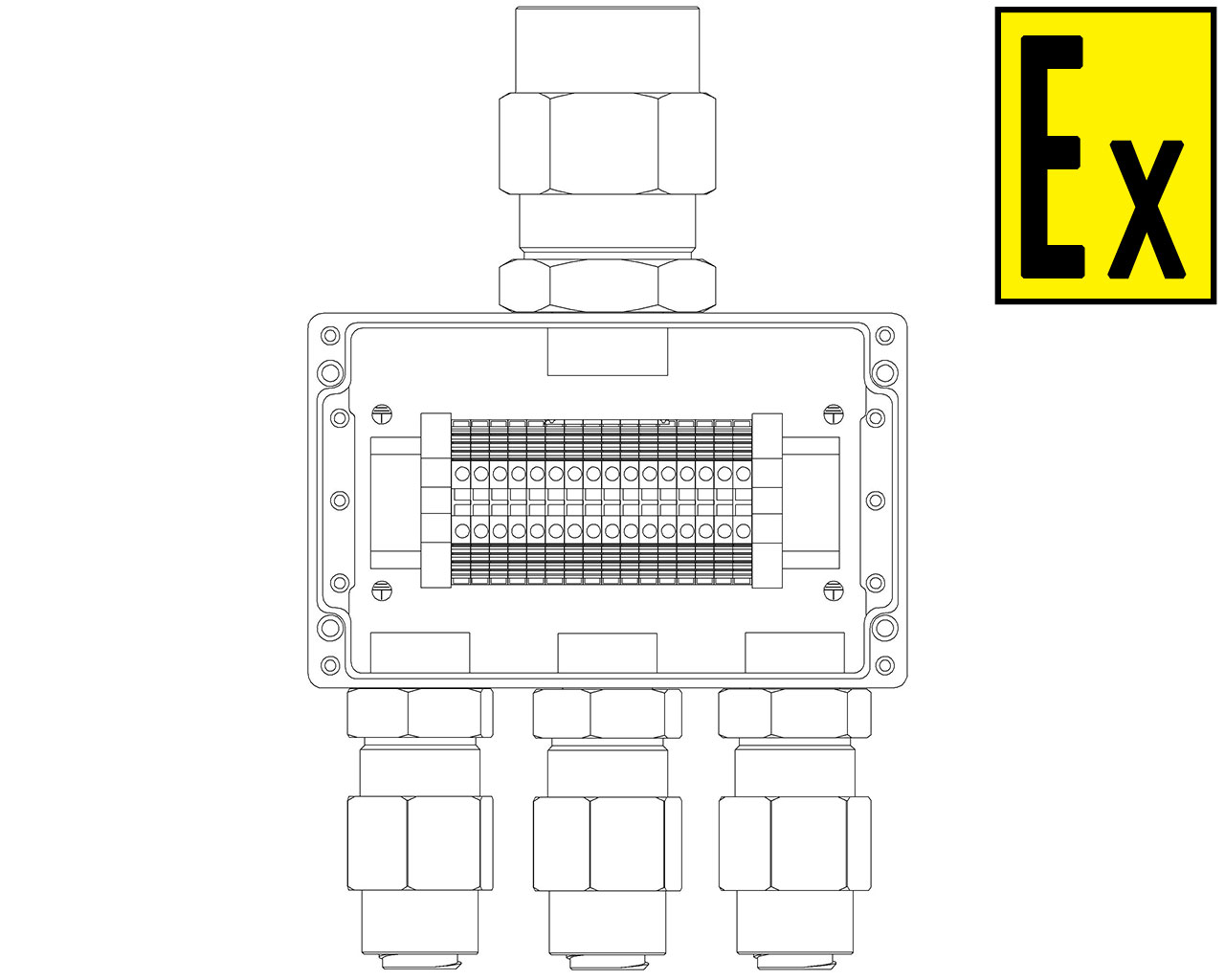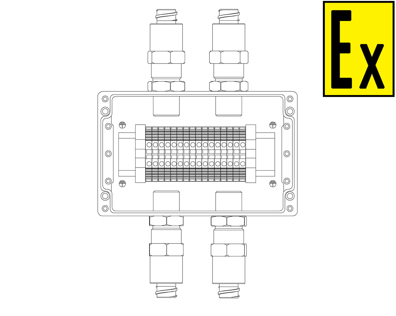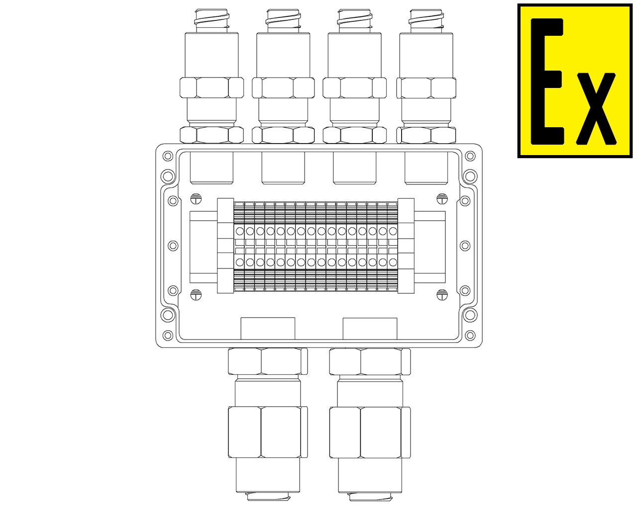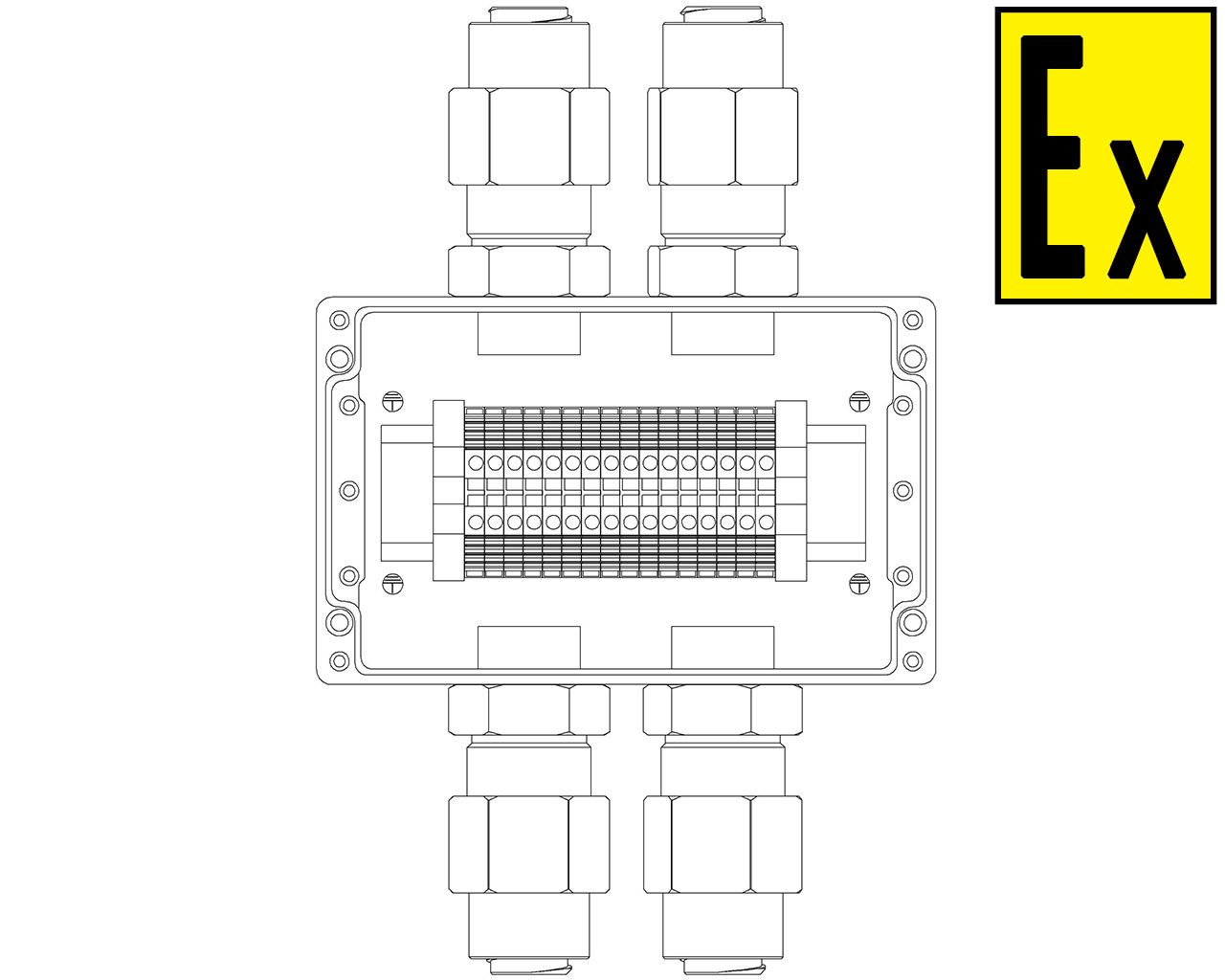 KVMK 1607, 1ExeIIBT5Gb, material - Aluminium alloy 100х160х81 mm, clamp terminals 0,5-4 mm2 I=25А -16 pieces, IP67, -60 ... +85°С, universal cable gland: kable ⌀6-12 mm/ Armoured cable. Crimp of wire armour/ for cable in metal hose ⌀15 mm - 4 pieces universal cable gland: kable ⌀10-16 mm/ Armoured cable. Crimp of wire armour/ for cable in metal hose ⌀20 mm - 2 pieces |