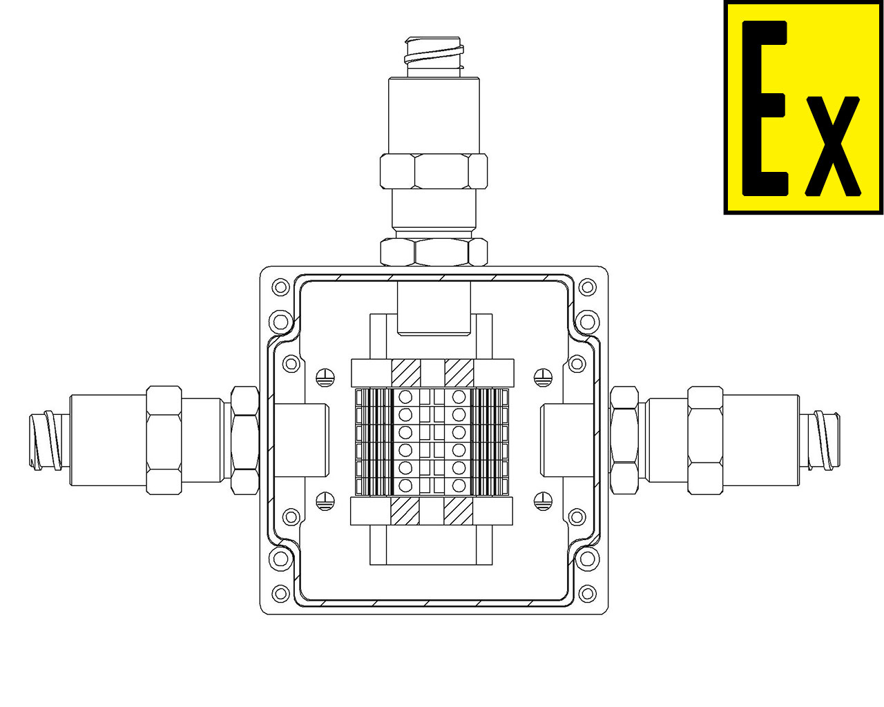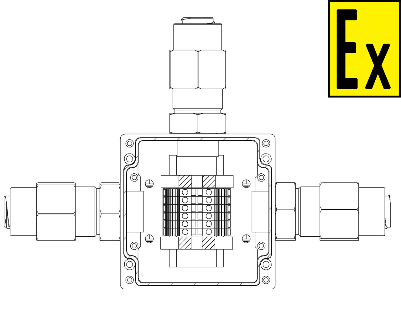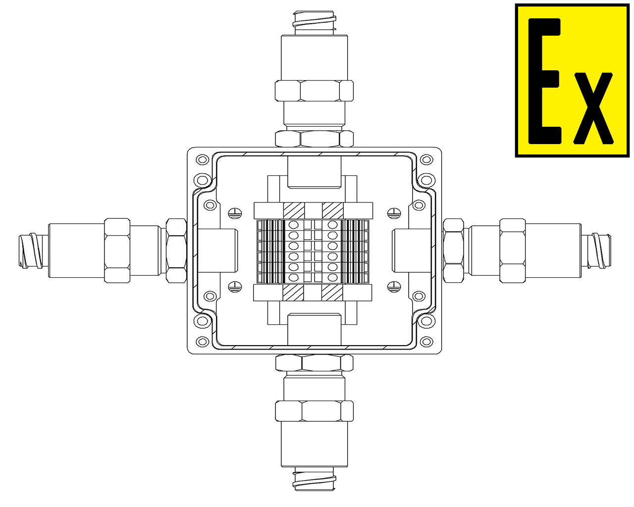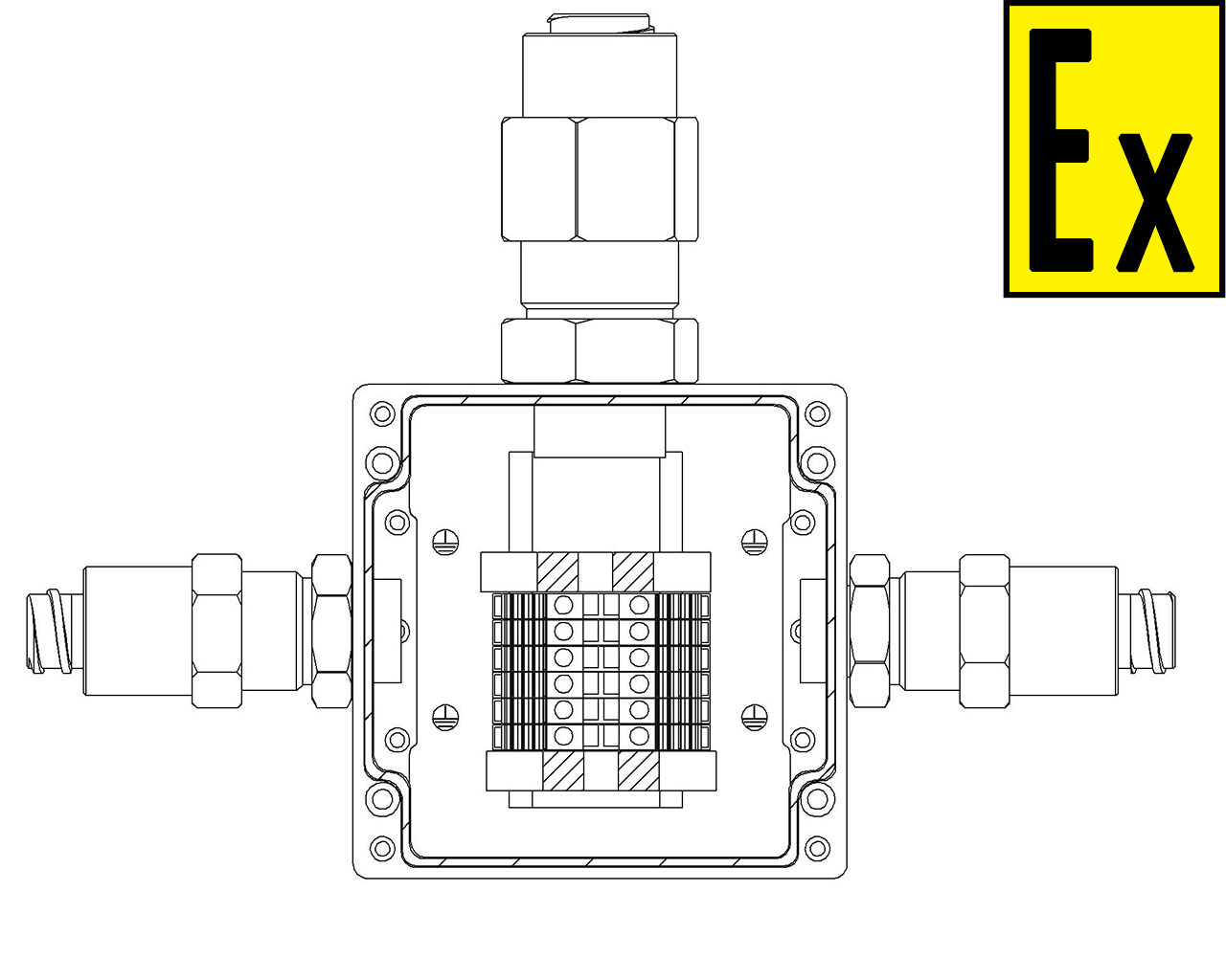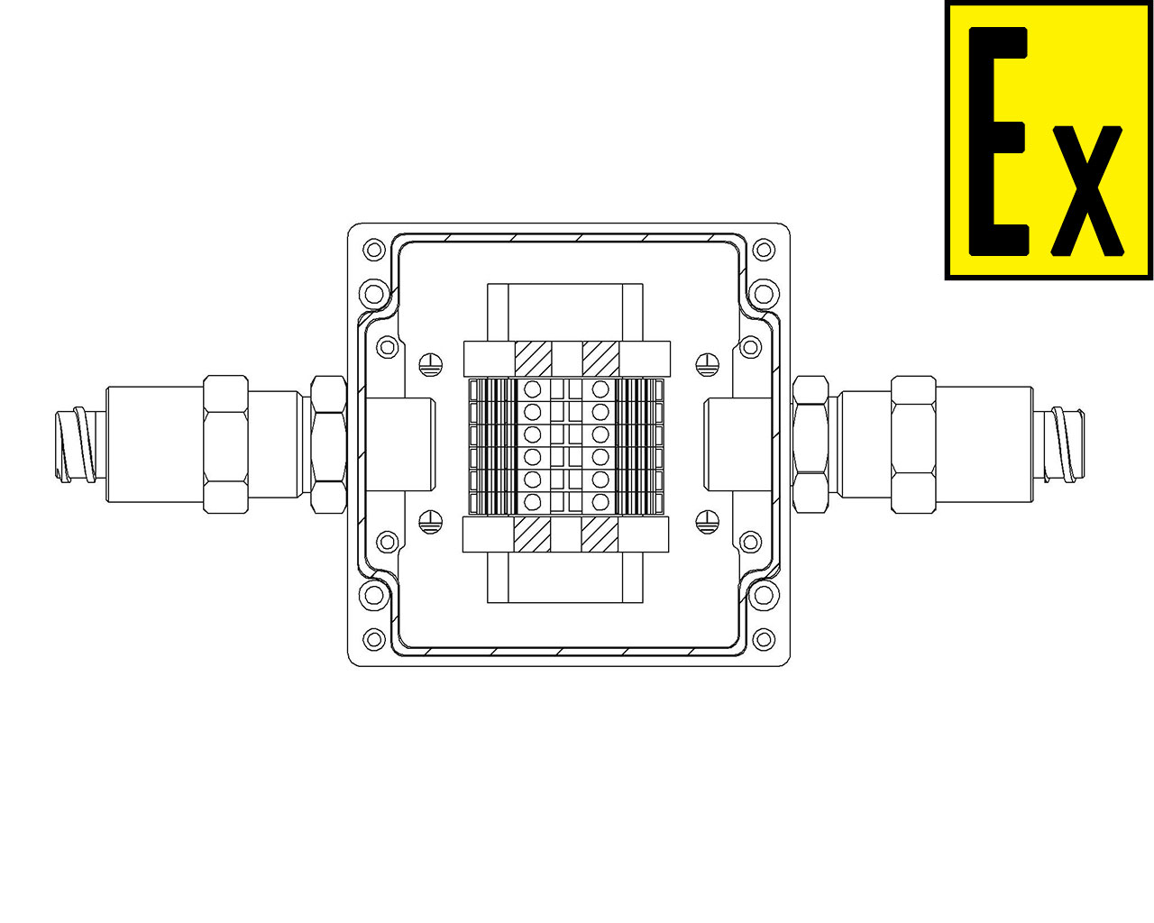 KVMK 1607, 1ExeIIBT5Gb, material - Aluminium alloy 100х160х81 mm, clamp terminals 0,5-4 mm2 I=25А -16 pieces, IP67, -60 ... +85°С, universal cable gland: kable ⌀6-12 mm/ Armoured cable. Crimp of wire armour/ for cable in metal hose ⌀15 mm - 4 pieces universal cable gland: kable ⌀10-16 mm/ Armoured cable. Crimp of wire armour/ for cable in metal hose ⌀20 mm - 2 pieces |