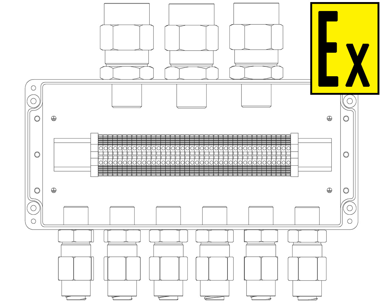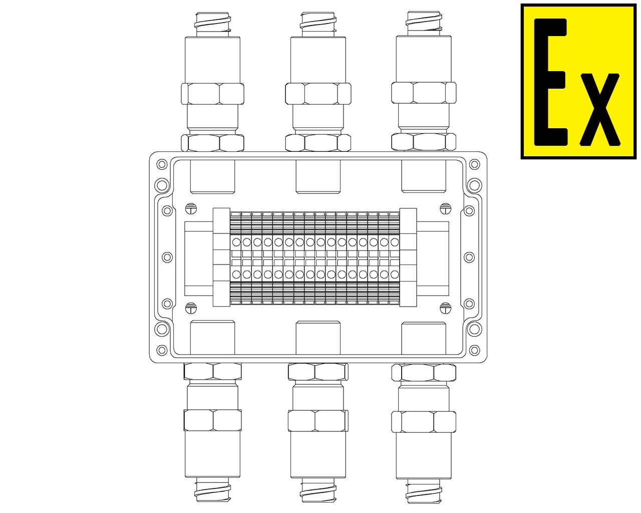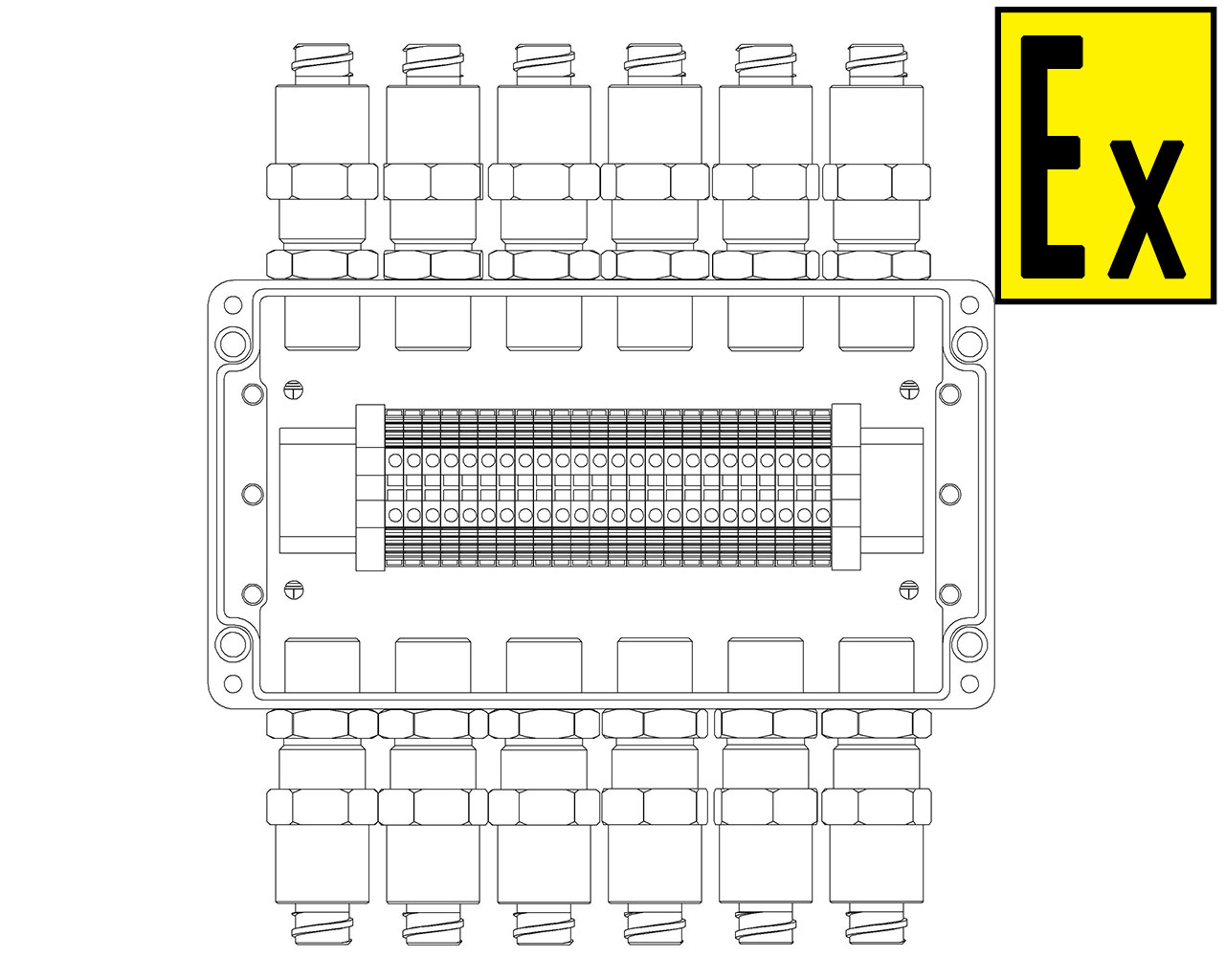 KVMK 2402, 1ExeIIBT5Gb, material - Aluminium alloy 120х220х91 mm, clamp terminals 0,5-4 mm2 I=25А -24 pieces, IP67, -60 ... +85°С, universal cable gland: kable ⌀6-12 mm/ Armoured cable. Crimp of wire armour/ for cable in metal hose ⌀15 mm - 12 pieces universal cable gland: kable ⌀10-16 mm/ Armoured cable. Crimp of wire armour/ for cable in metal hose ⌀20 mm - 1 pieces |