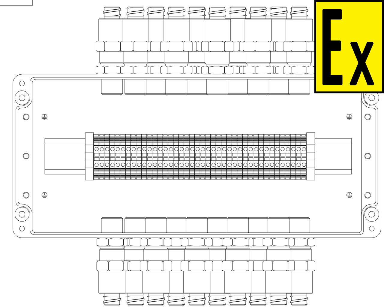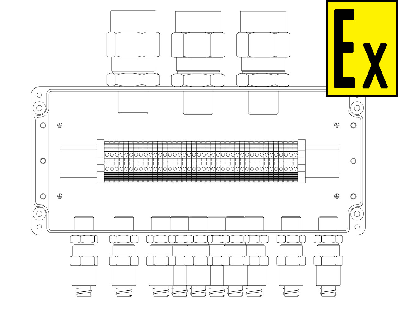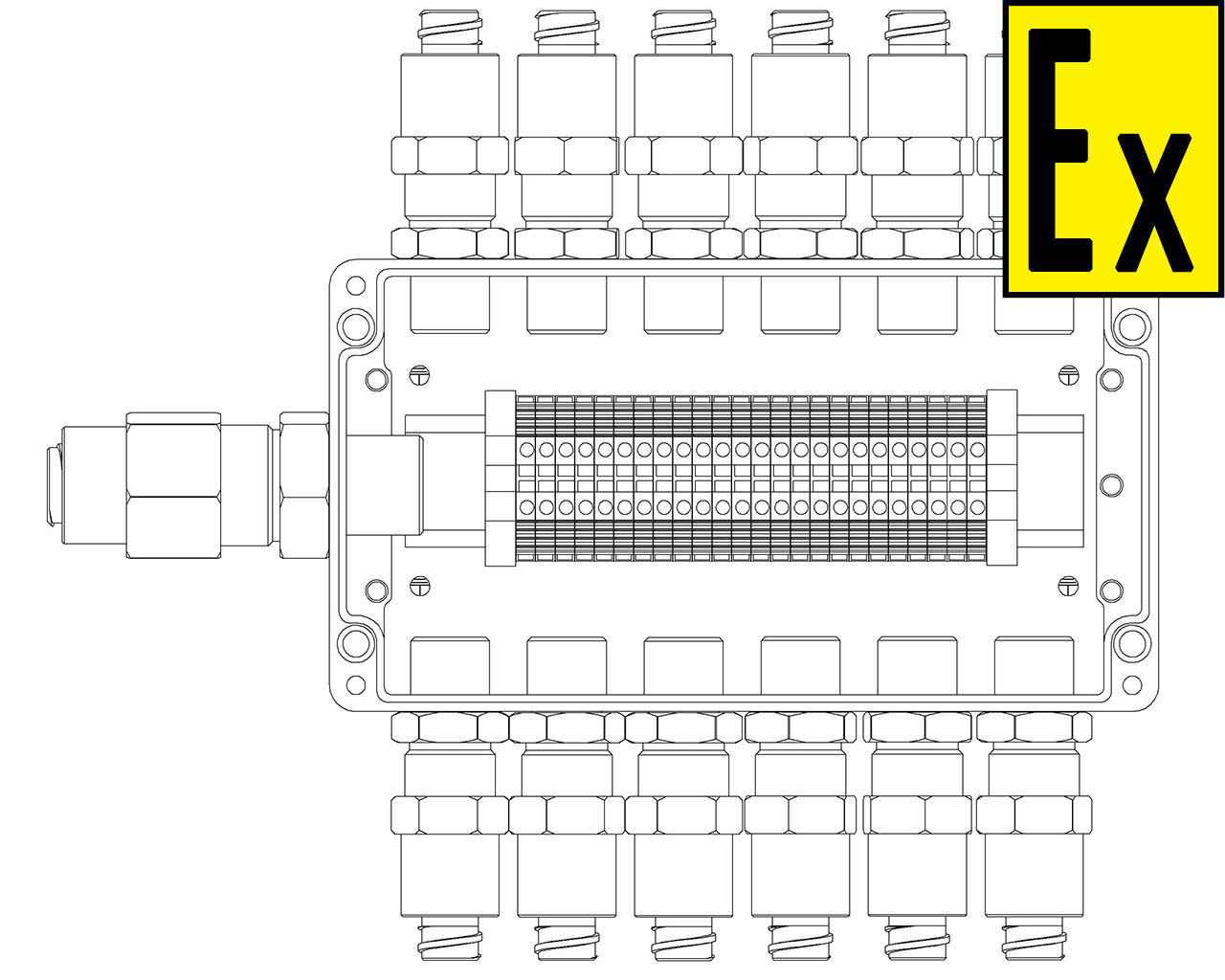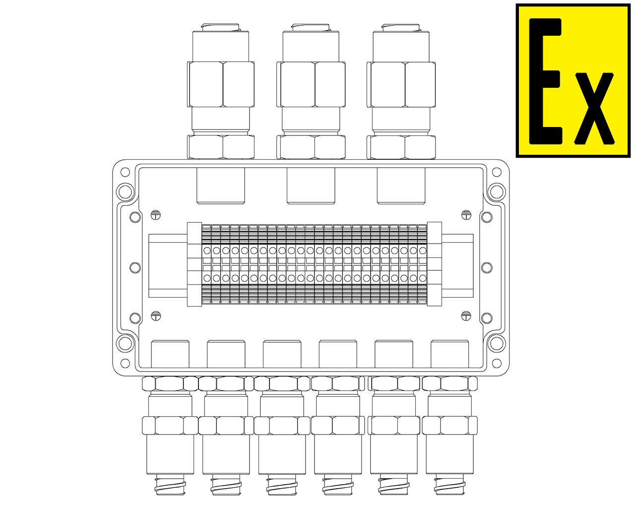 KVMK 2402, 1ExeIIBT5Gb, material - Aluminium alloy 120х220х91 mm, clamp terminals 0,5-4 mm2 I=25А -24 pieces, IP67, -60 ... +85°С, universal cable gland: kable ⌀6-12 mm/ Armoured cable. Crimp of wire armour/ for cable in metal hose ⌀15 mm - 12 pieces universal cable gland: kable ⌀10-16 mm/ Armoured cable. Crimp of wire armour/ for cable in metal hose ⌀20 mm - 1 pieces |