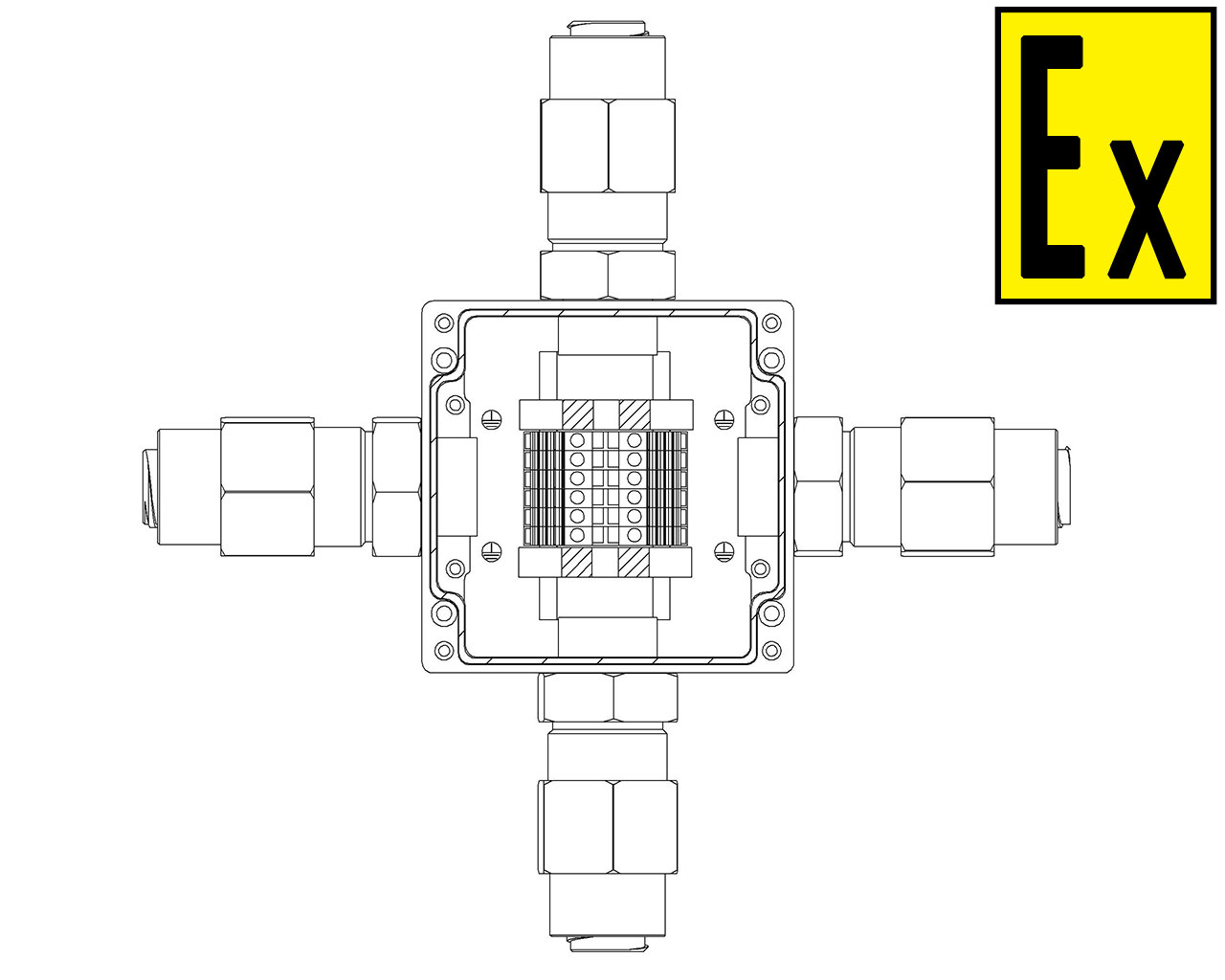 KVMK 607, 1ExeIIBT5Gb, material - Aluminium alloy 100х100х81 mm, clamp terminals 0,5-4 mm2 I=25А -6 pieces, IP67, -60 ... +85°С, universal cable gland: kable ⌀10-16 mm/ Armoured cable. Crimp of wire armour/ for cable in metal hose ⌀20 mm - 4 pieces |