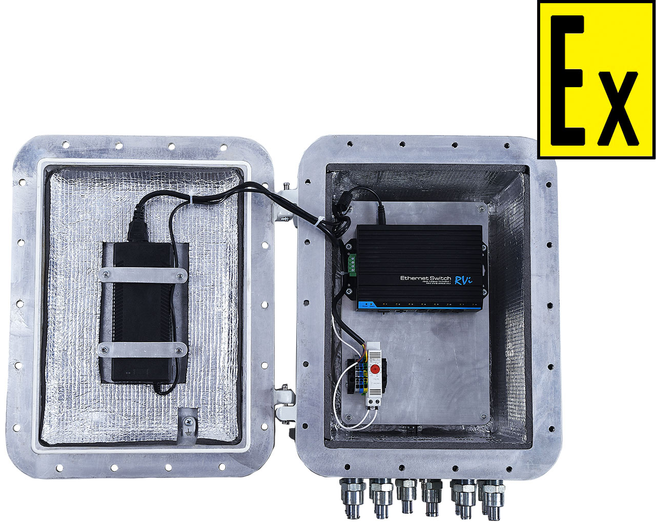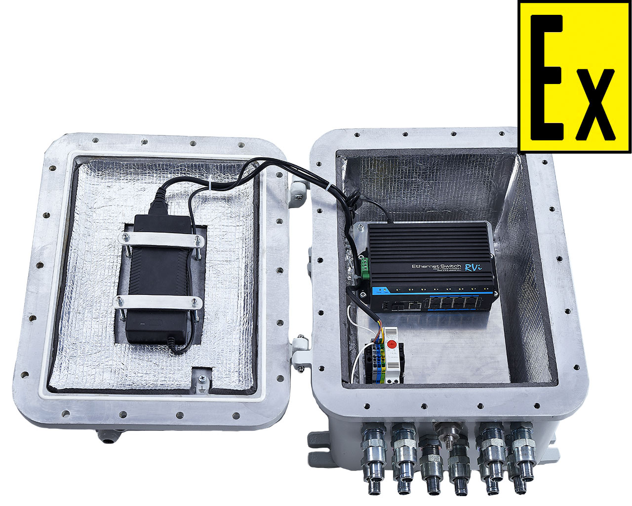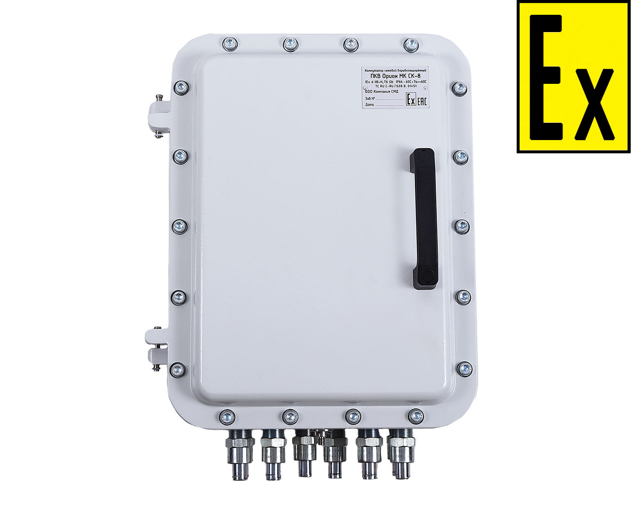 The design of the network enclosure of the explosion-proof PKV Orion MK SK switchboard is a separate explosion-proof enclosure that meets the requirements of GOST 31610.0-2014 and GOST IEC 60079-1-2011, consisting of a case, a rubber sealing ring of the cover. The lid is attached to the body with pivoting hinges and hermetically pressed against it with screws. The hinges connecting the lid and case are removable, so the lid can be completely detached from the case. The internal space of the flameproof enclosure allows optimal and convenient installation and maintenance for the internal components. The switch with the power supply unit is installed on the circuit board and is rigidly fastened with screws. Cables are supplied by explosion-proof cable glands, which, depending on the customer’s wishes, can be located on either side of the case, but also have a standard design. A heating plate with a thermostat is installed on one of the walls inside the shell, which allows you to maintain the optimum operating temperature for operation of the equipment mounted inside. The thermostat has a temperature control element that allows you to increase or decrease the temperature inside the shell. To reduce the rapid cooling plates are provided from izolona. On the outer side around the perimeter of the cover, spring washers are installed, pressing them with screws thereby preventing the unscrewing itself. Sealing two diagonal screws provides unauthorized access to the internal cavity.