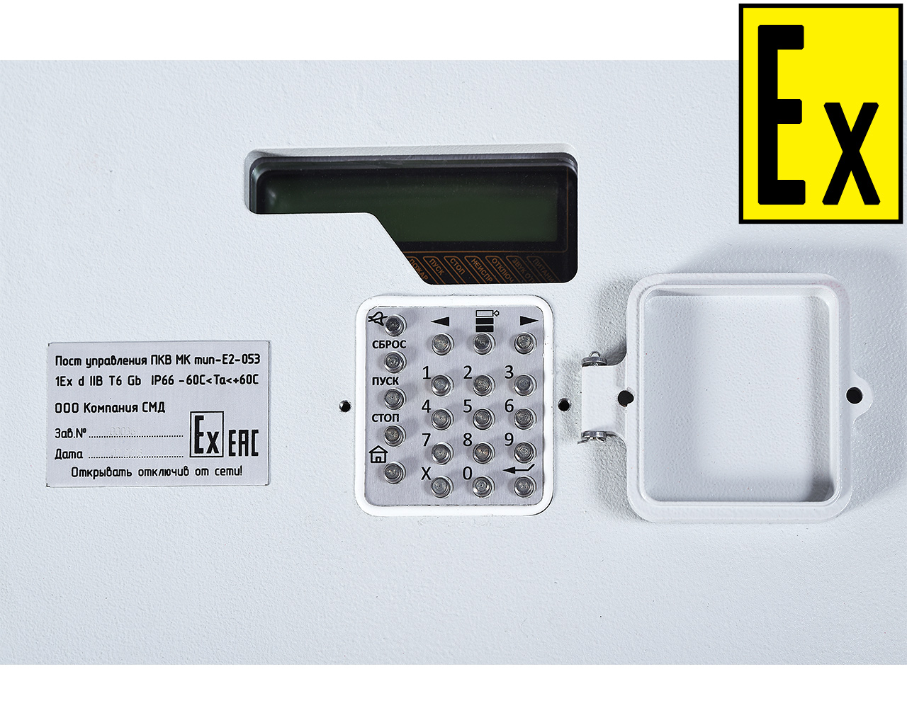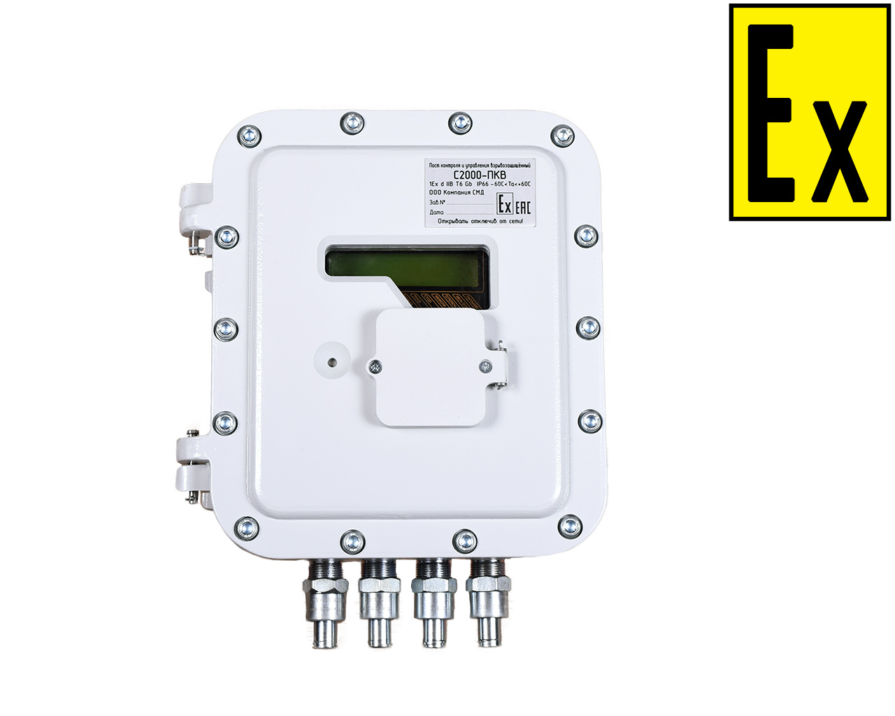 The S2000-PKV version 1 set is an explosion-proof enclosure with controls, cable entries and drainage device, as well as the S2000M remote control pre-installed in it. A thermostat and a heating element (plate) are provided inside the body to prevent the temperature from dropping below the allowable value and to mist over the viewing window. The S2000-PKV version 1 set can be installed in hazardous areas I and II. To build an OPS system, it is necessary to use additional devices (Signal 20P, etc.) and place them in explosion-proof shells (PKV MK, KVMK produced by SMD Company).